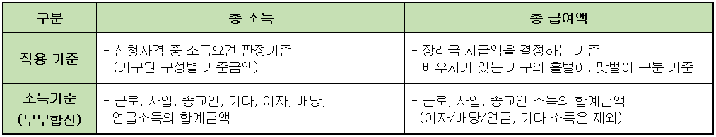 2022년 부부합산 총소득금액을 바탕으로 산정하며, 여기에 포함되는 항목으로는 1) 근로 2) 사업 3) 종교인소득 4) 이자/배당/연금 5) 기타소득이 있습니다. 가구원 구성에 따라 2022년 부부합산 총소득금액이 기준금액 미만이어야 하며, 총급여액 등에 의하여 장려금을 산정합니다