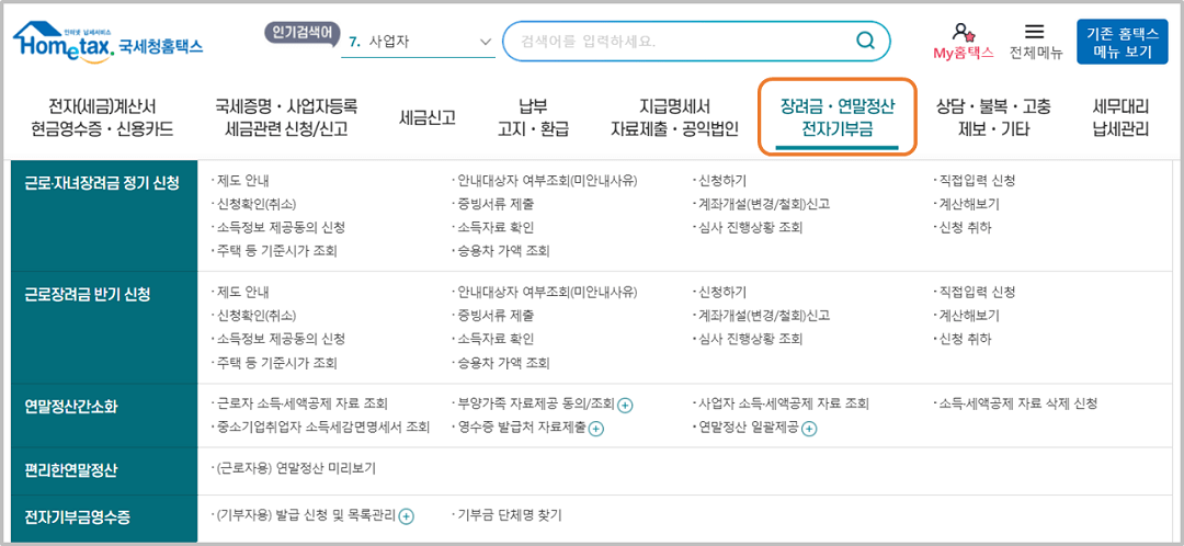 ① 국세청 홈택스에 접속하여 [장려금·연말정산 전자기부금] 탭에서 확인할 수 있습니다.