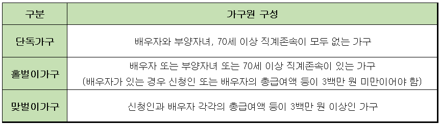 2022년 근로, 사업소득(전문직 제외) 또는 종료인소득이 있는 가구로서 가구유형, 총소득, 재산 기준을 모두 충족하는 경우에만 신청할 수 있습니다. 각 조건별로 자세히 살펴보겠습니다.